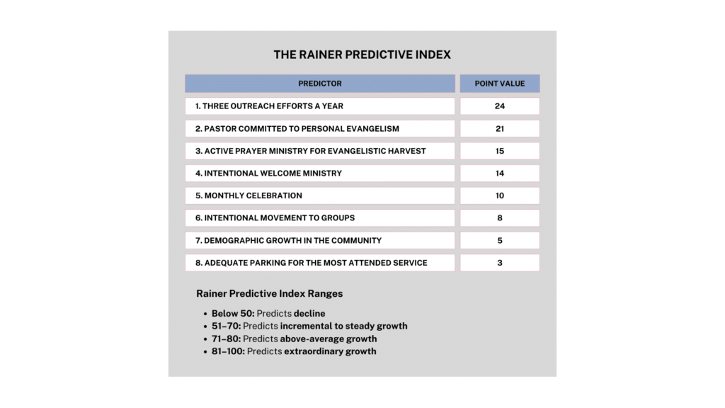 That is the purpose of the Rainer Predictive Index. It doesn’t replace prayer or dependence. It simply highlights the factors most strongly correlated with growing, healthy congregations.